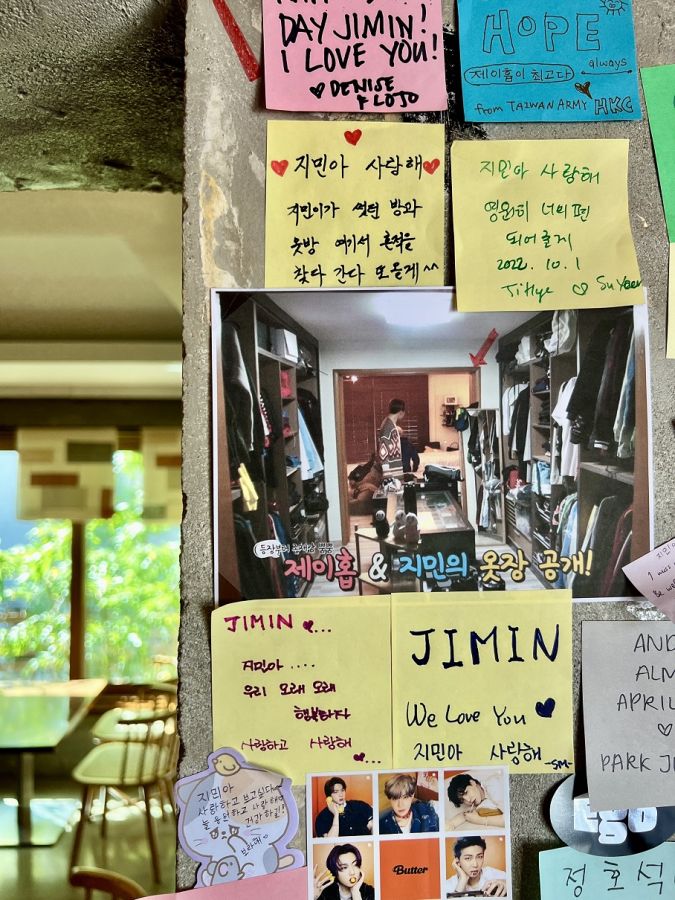 店内の壁には、世界中から集まるアーミーのメッセージが貼られて、それも美術作品の一部に見えるほどきれいに飾ってくれています。韓国語、英語はもちろんのこと、日本語や中国語、スペイン語など多国籍なメッセージがいっぱい。また、本来は10時30分から営業開始のところ、朝早くからお客さんがお店の前で待機しているのでできるだけ9時30分ごろから開けるようにしているそうで、旅行中の朝カフェとしても楽しんでください!とのことでした。さすがBTSファンのホットな聖地というのを感じることができる、休家でした。
