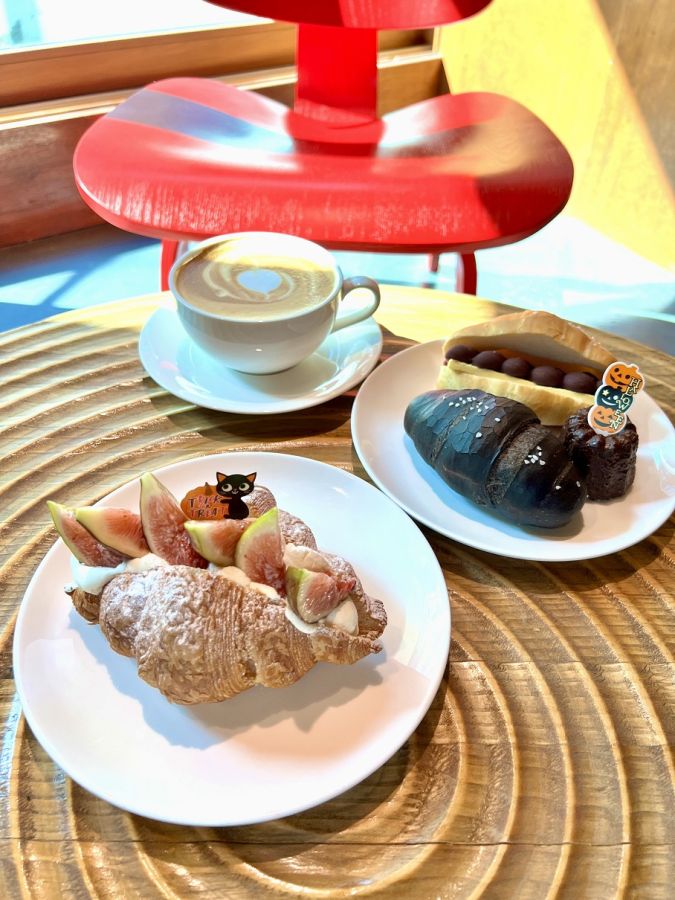 建物だけに目がいってしまいがちですが、カフェにあるパンやドリンクも丁寧にこだわって作っていておいしいと評判。特に人気なのは、「防弾塩パン(バンタンソグムパン)」2000ウォンで、こちらはイカ墨を使ったブラック塩パン。地下1階に練習室があったとお伝えしましたが、この練習室が壁、床、ステレオなどオールブラックのインテリアだったそうで、それにちなんで“BTSのパン”として黒を使ったものを作りたい!というアイデアから生まれたんだそう。写真は手前から「季節のフルーツ生クリームクロワッサン」7800ウォン、「防弾塩パン」2000ウォン、「クラシックカヌレ」3000ウォン、「餡バター塩パン」3800ウォン、奥は「カフェラテ」5800ウォン。