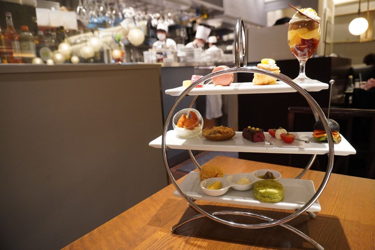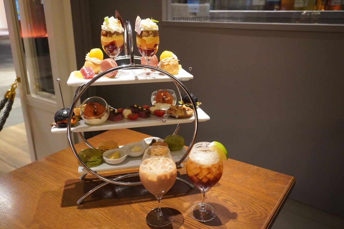 スタンドの下の2段はお食事系。スモークサーモンの竹炭バーガー、シュリンプフライ、和牛ローストビーフ・カプレーゼのピンチョス、チキンとマッシュルームのグラタン、スコーン2種(ホウレンソウ&クルミ・ドライトマト&ハーブ)と3種のディップ添え。上の段は、紅茶のミニパフェ、季節フルーツのシュー、マカロン、パート・ド・フリュイなど、デザートがずらり!ティーカクテルなど好きなドリンクも選べます。幸せな気分でハイティを堪能できますよ。