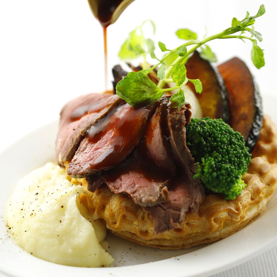お酒と一緒に楽しめて、シェアしやすい、本格派の英国料理もそろっています。人気の「ヨークシャープディング」1480円は、丁寧に作られた和牛のローストビーフが、やわらかくてとてもジューシー。見た目のインパクトも大!