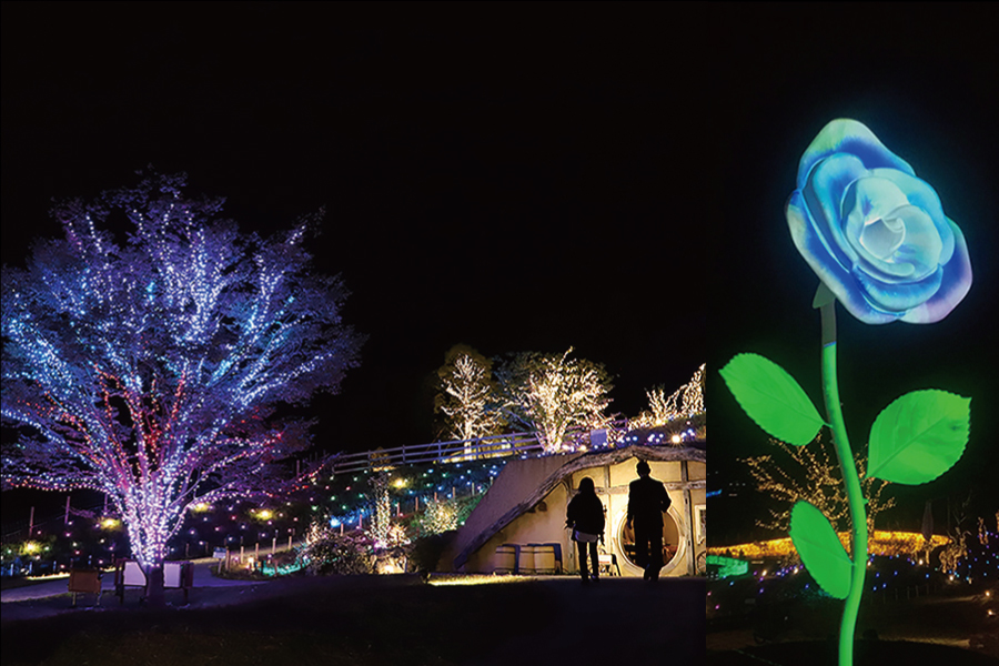 来場者が鳴らす鐘の音や専用のペダルに反応して点灯と演出が始まる「奇跡の青いバラ」や「七色に輝く祈りの木」のイルミネーション体験が人気です。