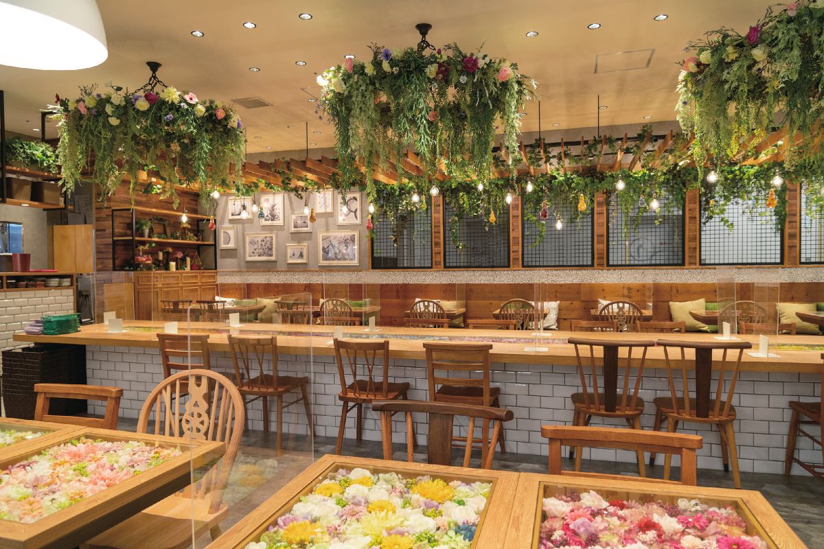 花をイメージして素材を盛り付ける「フラワーキッシュ」の専門店。カラフルな椅子や花が置かれた華やかな店内は実にフォトジェニック。
