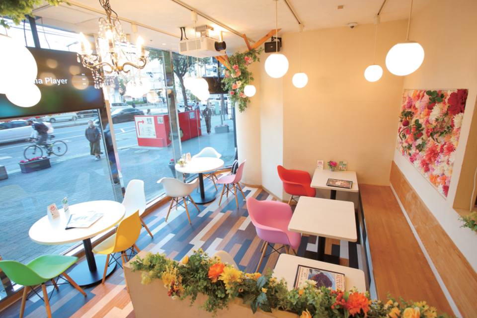 華やかなビジュアルのパフェが支持されている「パフェテリアLARGO」。店内はテーブル表面のアーティフィシャルフラワーが特徴的。席ごとに異なる色が楽しめます。