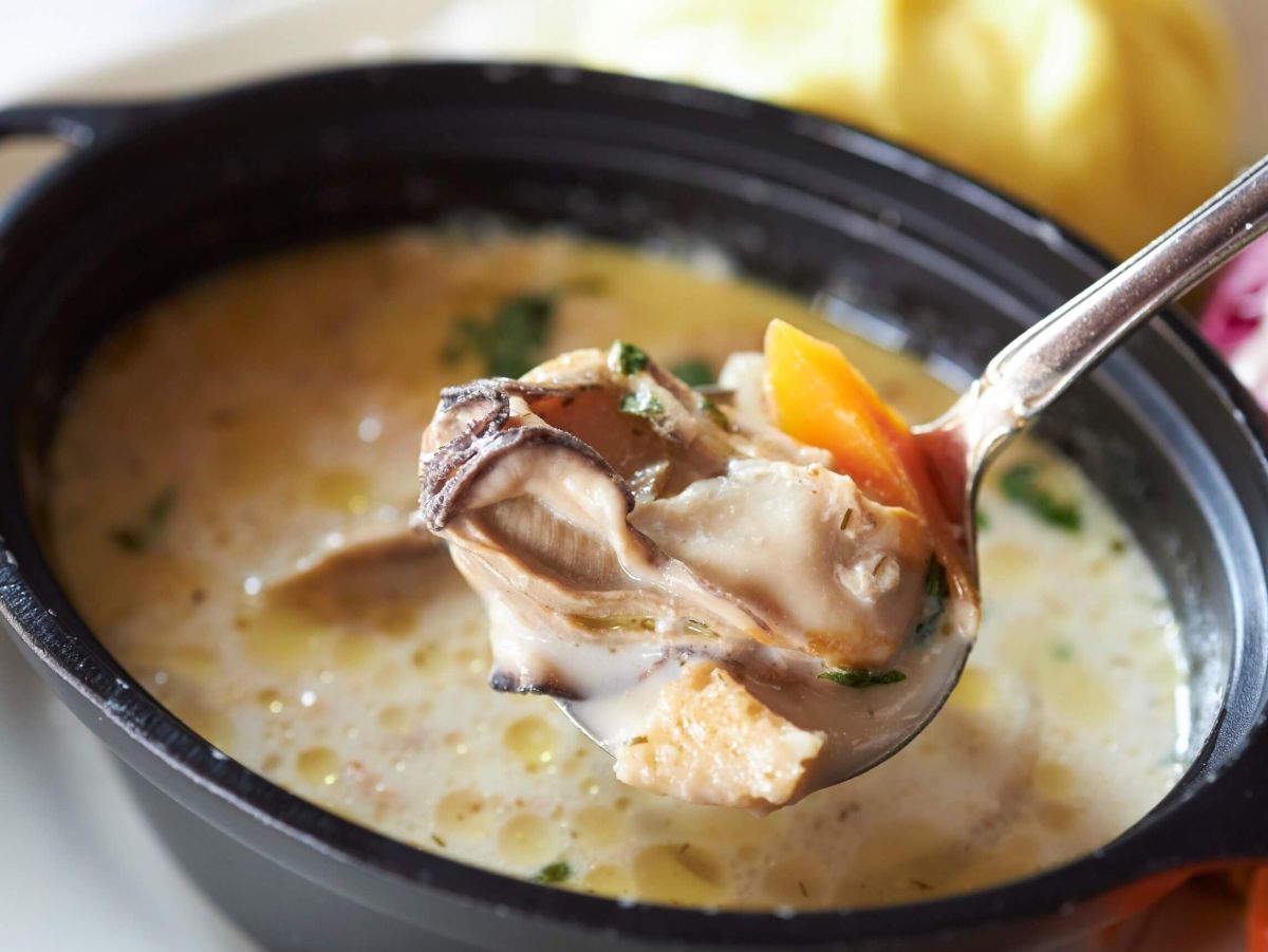 今回オーダーしたのは、広島県産のカキがごろっと入った「オイスターチャウダー」。もともとは季節限定のメニューでしたが、あまりの人気でレギュラーメニューに昇格させたのだそう。味わい深いフレンチベースのストック(だし)はもちろん、クリーミーさのなかにカキのうまみとコクが溶けだしたぜいたくなひと品は必食です!