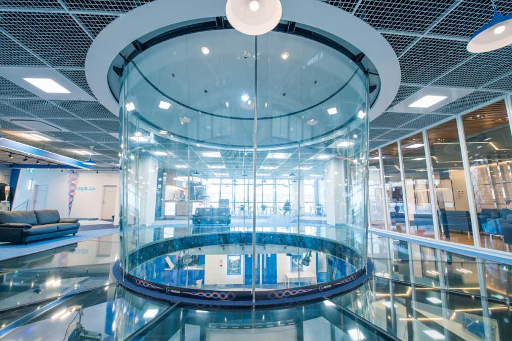 ウィンドトンネルは直径4.5m、高さ19.8mの円柱。この建物の中にモーターが2つあり、その風を循環することで、トンネル内には常時風速200kmもの暴風が吹いています。