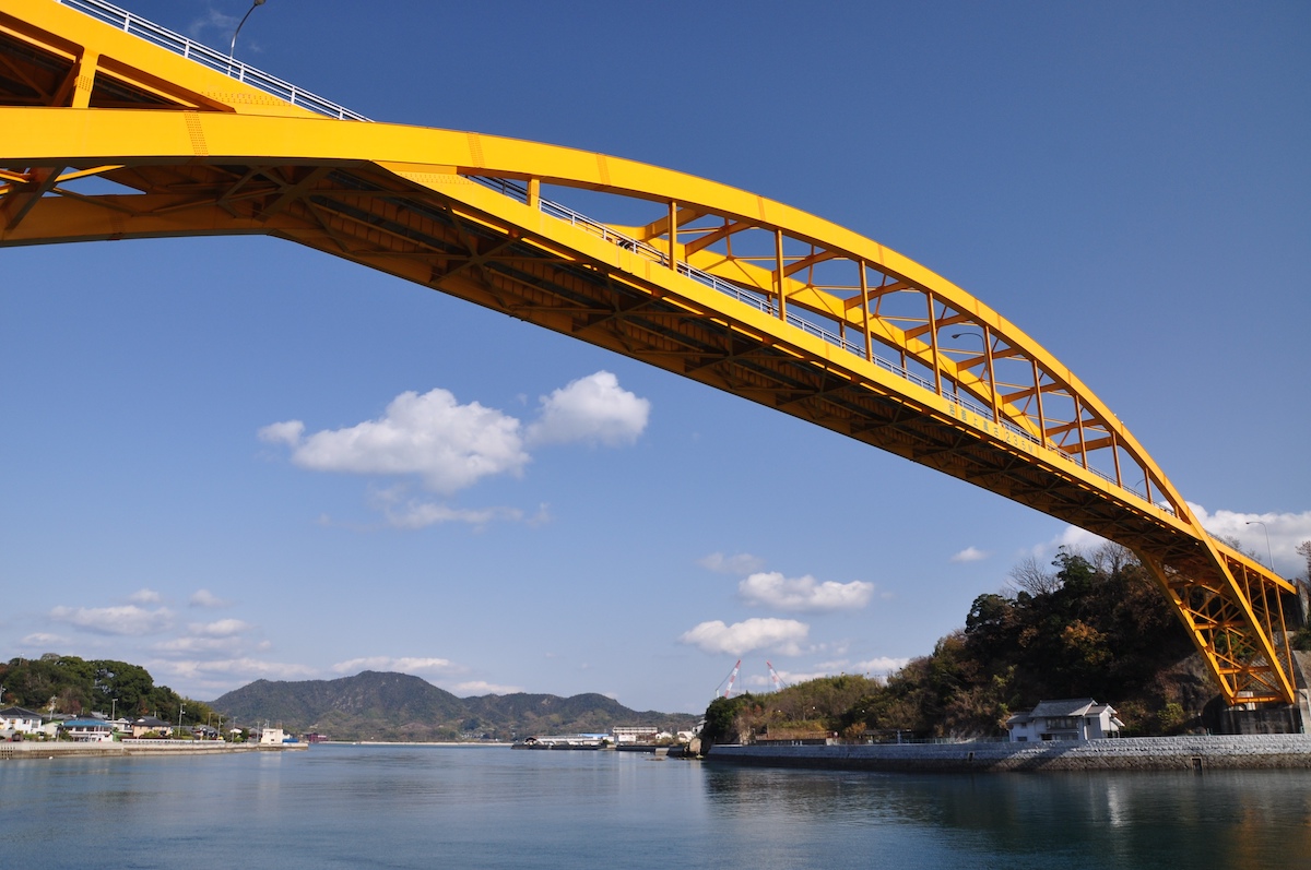 生口島と高根島は、黄色い高根大橋で結ばれています。“レモンの島”らしいビタミンカラーがなんともかわいく、空に映えますね♪