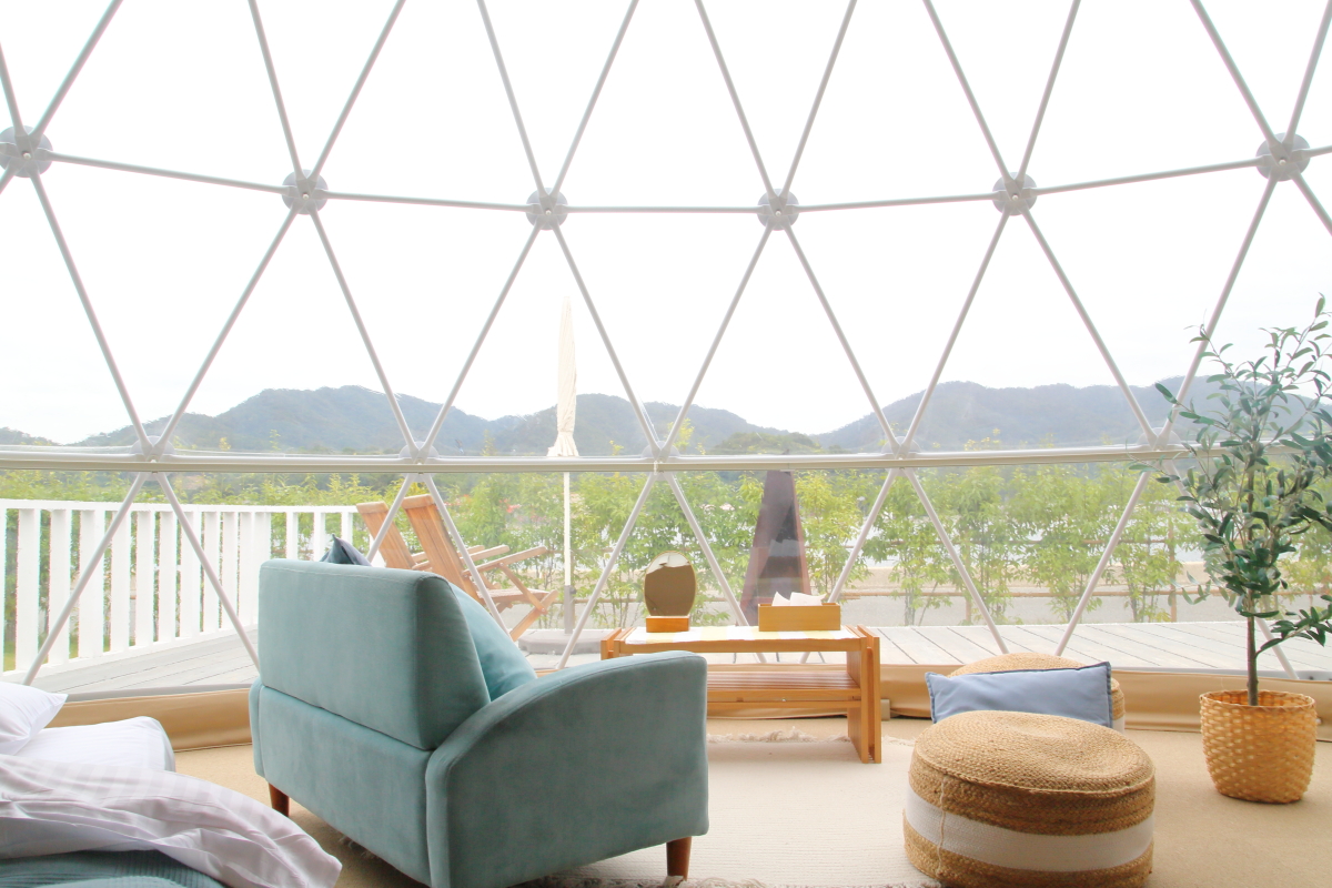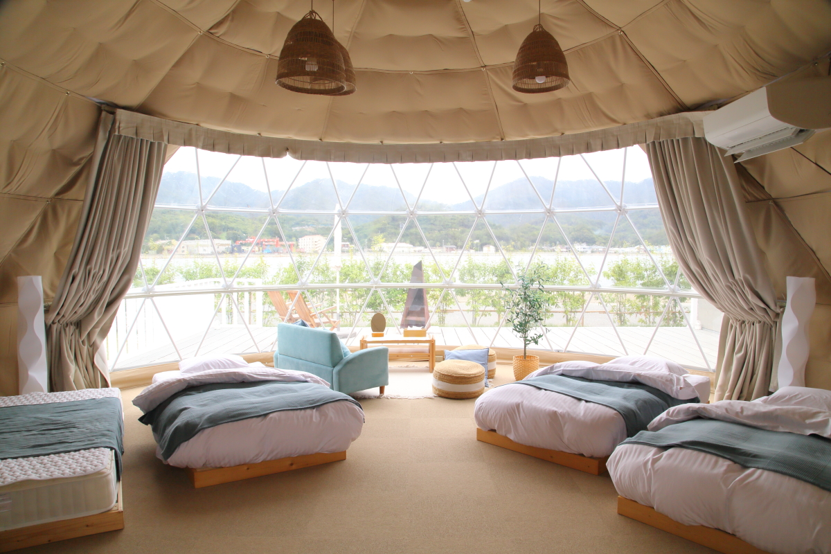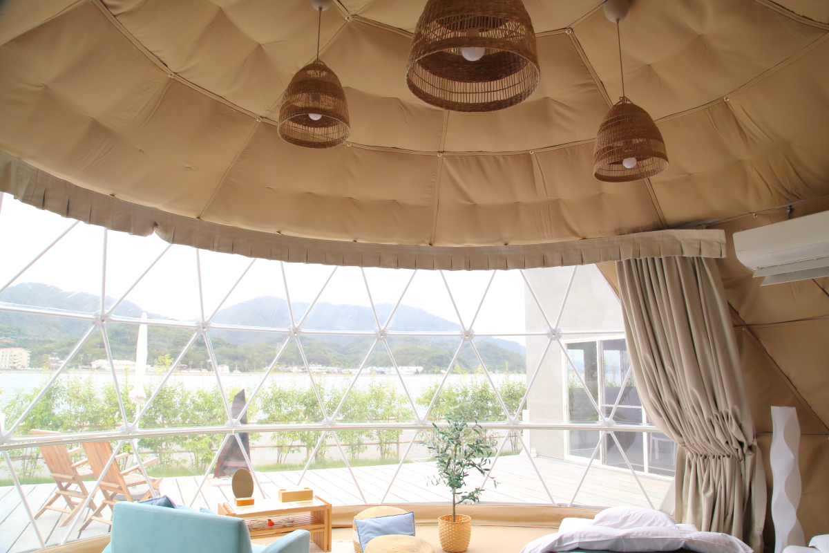 まずはドームテントからご紹介。ドームテントは全室が瀬戸内海に面し、カーテンを開くとそこはオーシャンビューという最高の開放感。