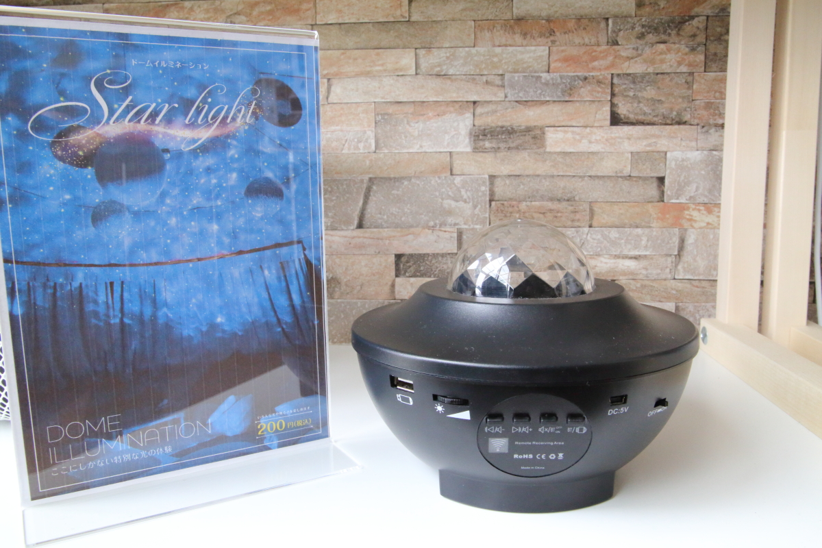 ドームテントをプラネタリウムのような幻想的な空間に変えてくれる、ドーム内イルミネーションのレンタルは200円。ドームの天井を活かした、ここならではの体験ができます。