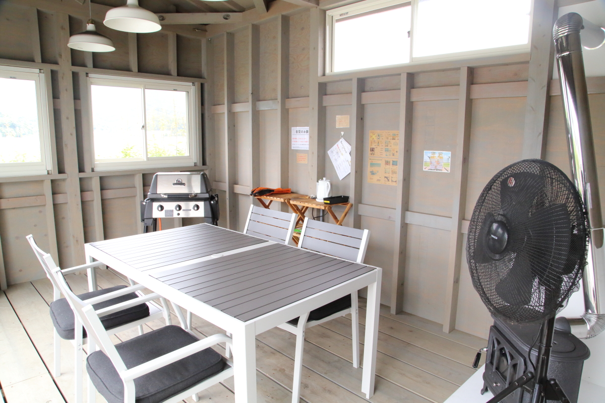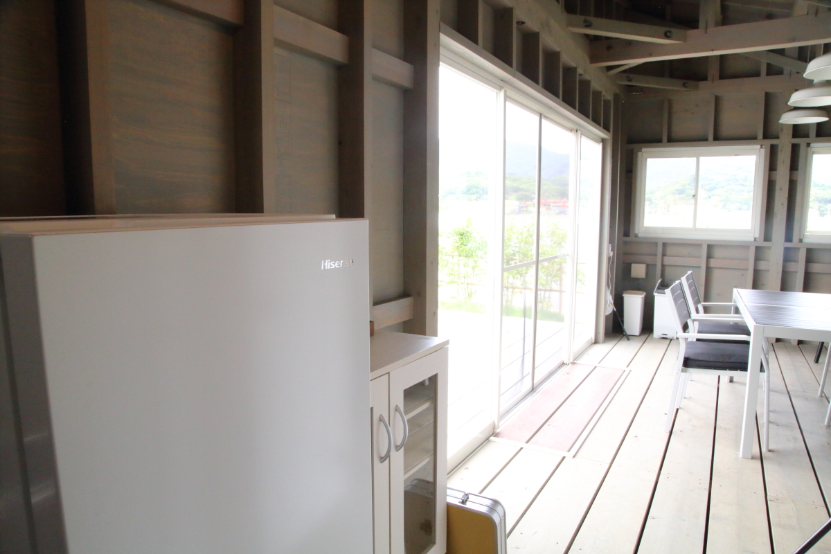 大きな冷蔵庫や備え付けのキッチンがあり、食器、調理用具なども自由に使用することができます。屋根付きの山小屋のような空間で、全天候対応だからアウトドア初心者も安心して存分に楽しめます。冷蔵庫には、塩、コショー、わさび、バーベキューソースのほか、各種調味料も用意されています!
