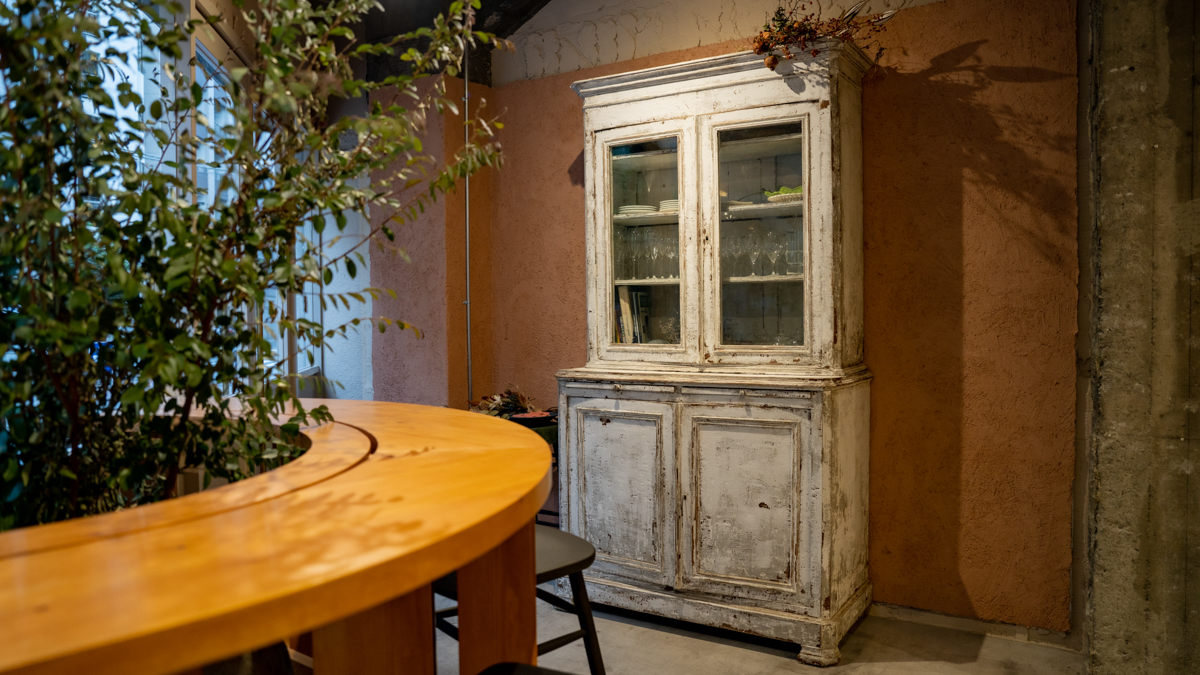 内装を手かげたのは台東区千束のインテリアギャラリー「es quart(エス クォート)」。フランスで買い付けたビンテージ、アンティークの家具を中心に、グレイッシュなピンクやベージュをバランスよく配した心落ち着く空間に仕上がっています。