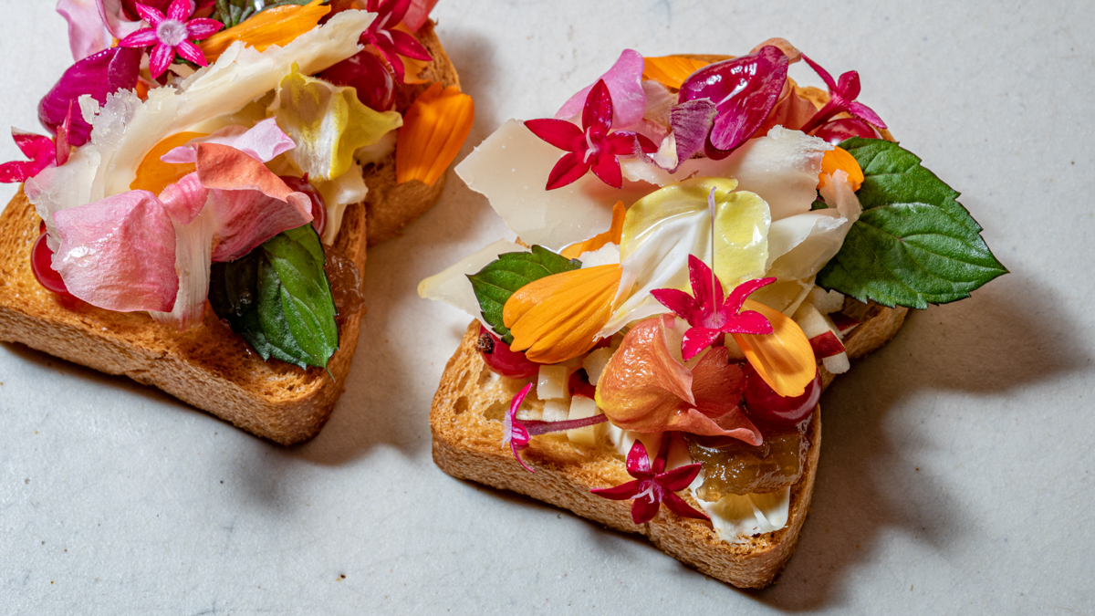ラスクにした「BEAVER BREAD」の山型食パンの上に、甘みのあるクロテッドクリーム、甘酸っぱい自家製ジャム、うまみの詰まったコンテチーズがのった複雑な味わい。さわやかなミントと野性味あるエディブルフラワーの風味も利いています。
