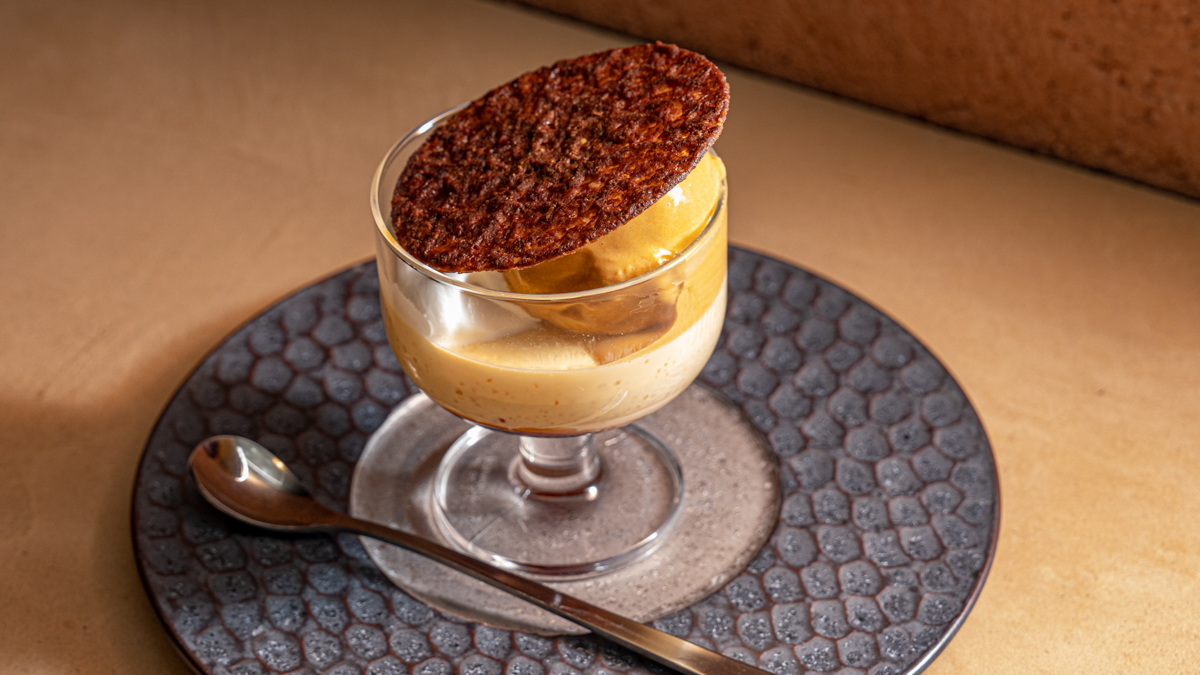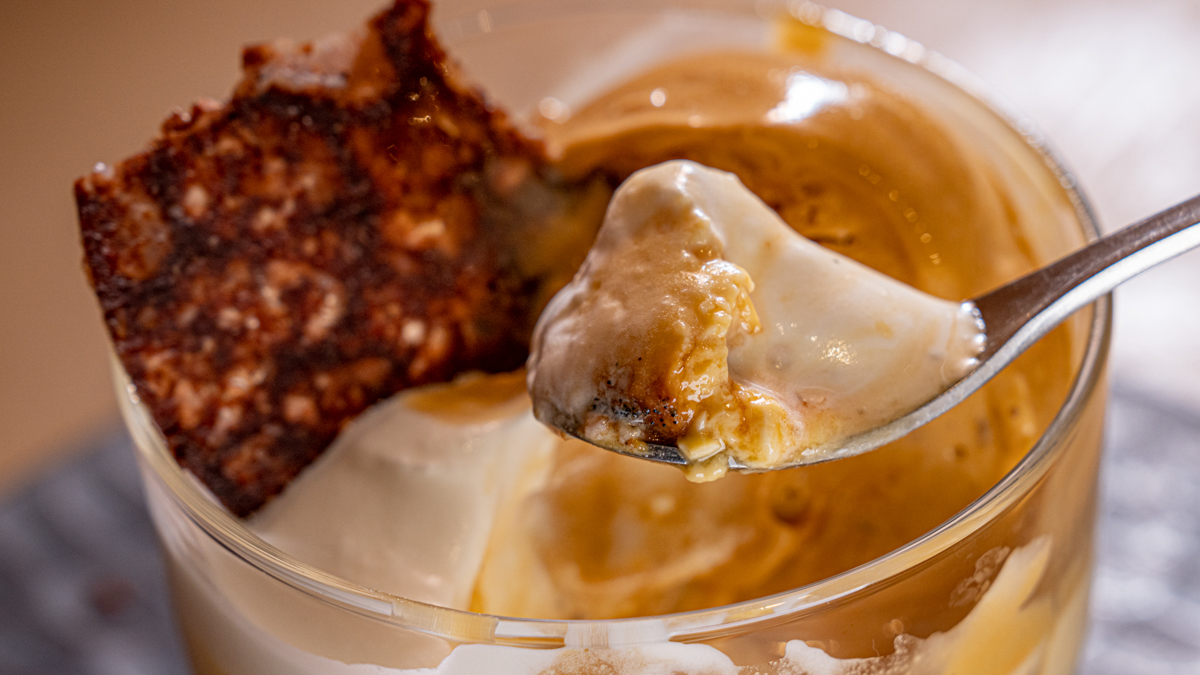 同じくカフェタイムの人気スイーツ「プリン」600円にプラス200円で「自家製アイス」をトッピングしました。こちらはパリパリとしたキャラメルカカオのチュイールを崩しつつ、トロトロでクリーミーなプリンを一緒に味わうスタイルです。