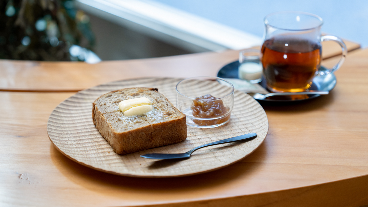 定番メニューは「トースト」400円。くるみサワーブレッドやパンドミといった「bouquet」用に焼きあげているという3種類ほどの食パンから選べます。今回はサワー種を使用したやさしい酸味のある全粒粉のパンを、リッチな香りの国産無塩発酵バターとともに楽しみました。
