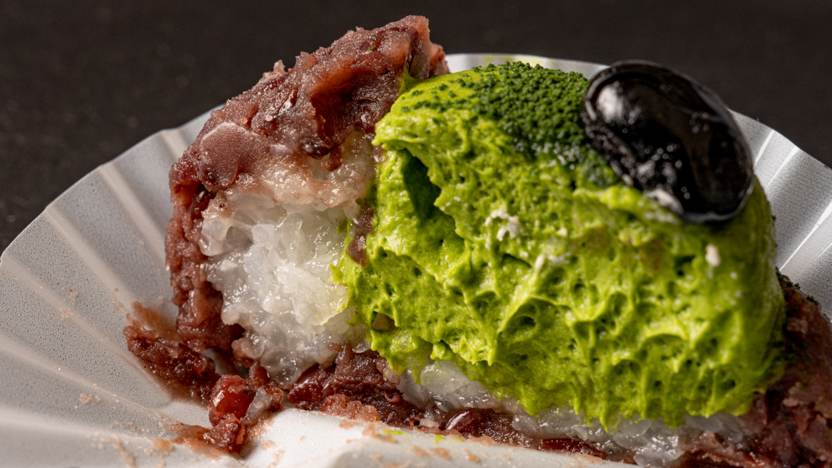 さっそく店頭に設置されたテラス席で「抹茶」390円を実食。まず驚いたのが口いっぱいに広がる非常に豊かな抹茶の香りです。こちらは高級宇治抹茶「瑞鳳」をぜいたくに使用したもの。その心地よいほろ苦さが、少し塩気を利かせた餡子、乳脂肪と甘さを抑えた上品な生クリームを絶妙に引き立てています。抹茶クリーム、もち米、餡子、三層の味と食感のバランスも最高。キャリア30年のパティシエが腕によりをかけた自信作ということが伝わる、緻密な計算を感じる味わいでした。
