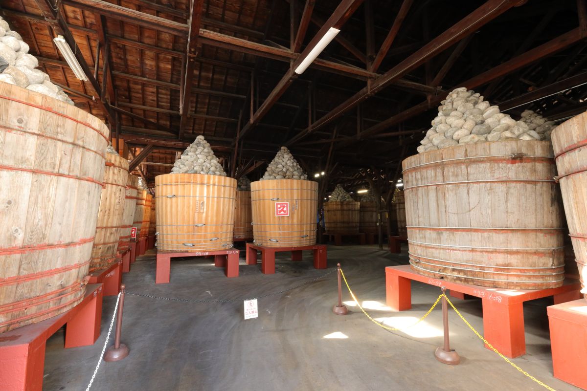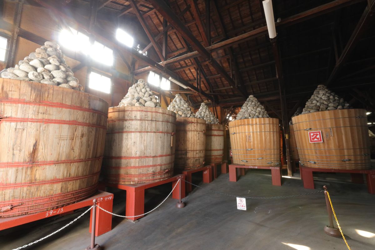 そして見学のクライマックスとも言えるのが甲子蔵(きのえねぐら)です。閉ざされた扉を開けると現れるのは、連なる巨大な味噌桶。円すい状に重石が積まれた桶のなかで、八丁味噌を熟成させているのです。温度調整は一切せずに自然の温度変化に任せ、二夏二冬(2年以上)かけてゆっくり熟成の時を待つ味噌。