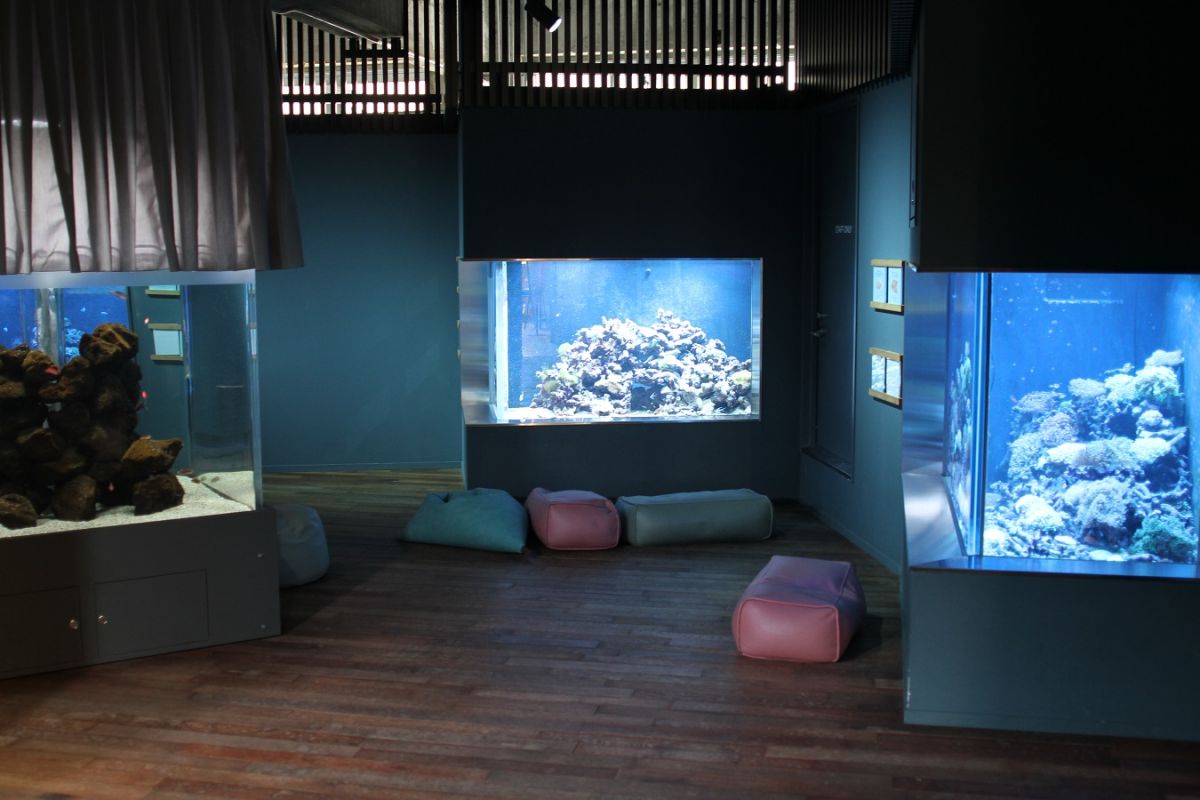 みなとやま水族館の展示の特徴は、水槽の位置が低いところ。水槽の前にイスやクッションが置いてあり、座ってじっくりと生きものを観察できるんです。