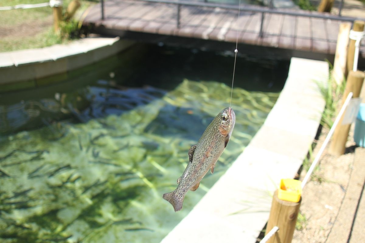 みなとやま水族館を訪れたら、ぜひチャレンジしてみてほしいのがニジマス釣り。館外にある釣り堀「FISH POND」で、気軽に釣りを楽しむことができるんです。