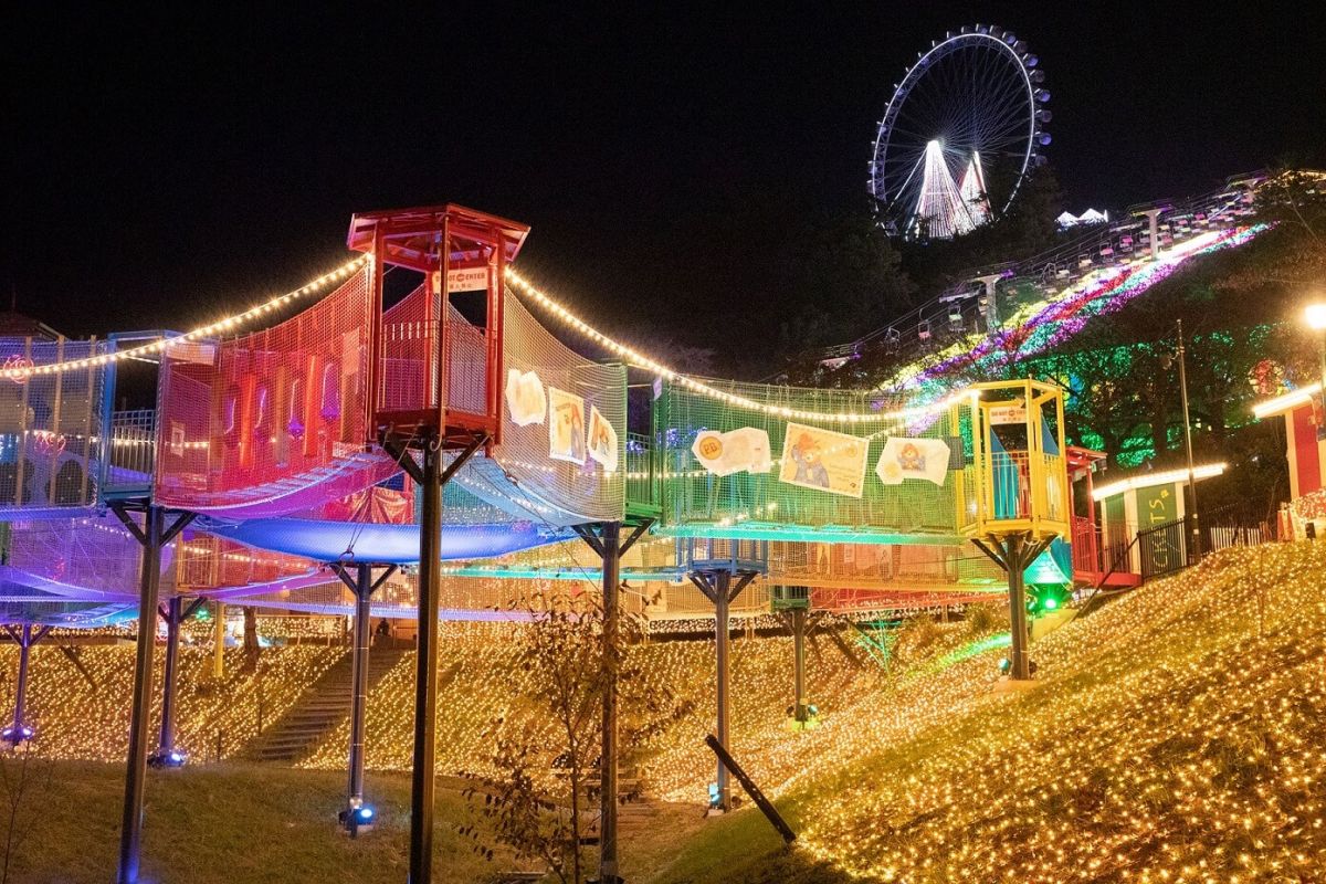 期間中は、普段のアトラクションがライトアップされ光の中で思いっきり身体を動かして遊べる「光の空中アスレチック」など、イルミネーションに囲まれる約10種類のナイトアトラクションが登場。