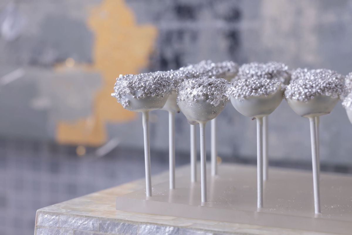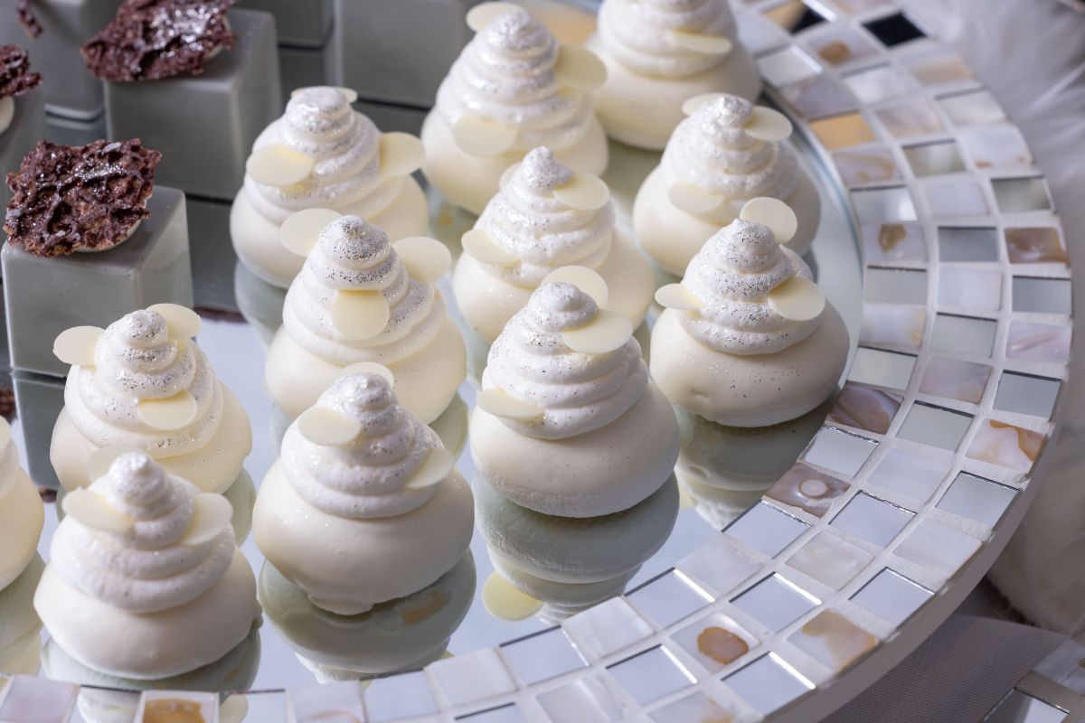メインカラーのシルバーとグレー、シンプルな白と黒で統一されたスイーツ。モノクロームの中に光るシルバーがスタイリッシュなスイーツビュッフェを演出しています。