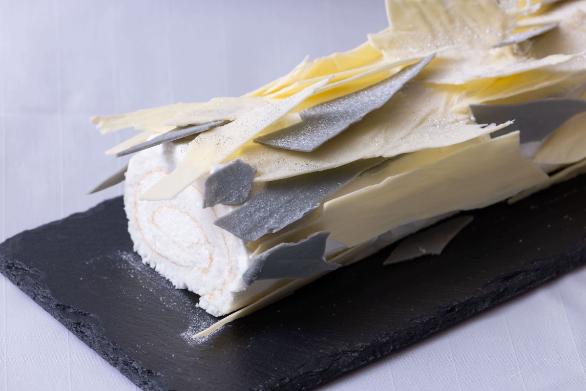 「シルバーブッシュ・ド・ノエル トンカ豆クリーム」は、しっとりとしたやさしい甘さのロールケーキに白とグレーのホワイトチョコレ―ト、銀箔をあしらっています。