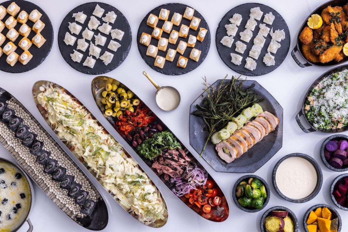 コンラッド大阪のスイーツビュッフェの魅力の一つに、充実のセイボリーアイテムがあります。今回は、「チーズフォンデュ」やウィーン風のフライドチキン「バックヘンデル」、「ポークコルドンブルー」など、ホリデーシーズンに合わせた全10品。コールドディッシュの数々は、スイーツとともにフォトジェニックなラインナップです。