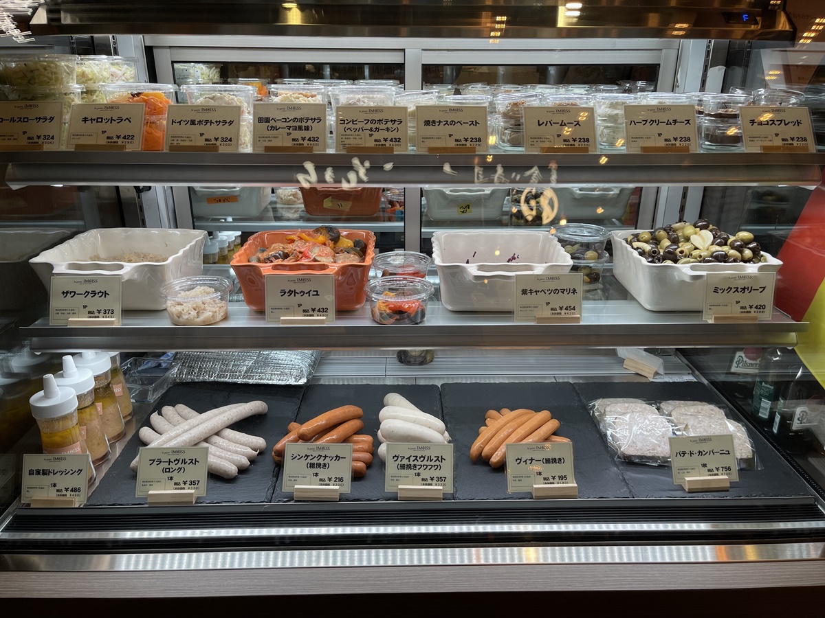店頭にはテイクアウト用のデリやソーセージ、プレッツェル、サンドイッチなどがずらりと並んでいます。