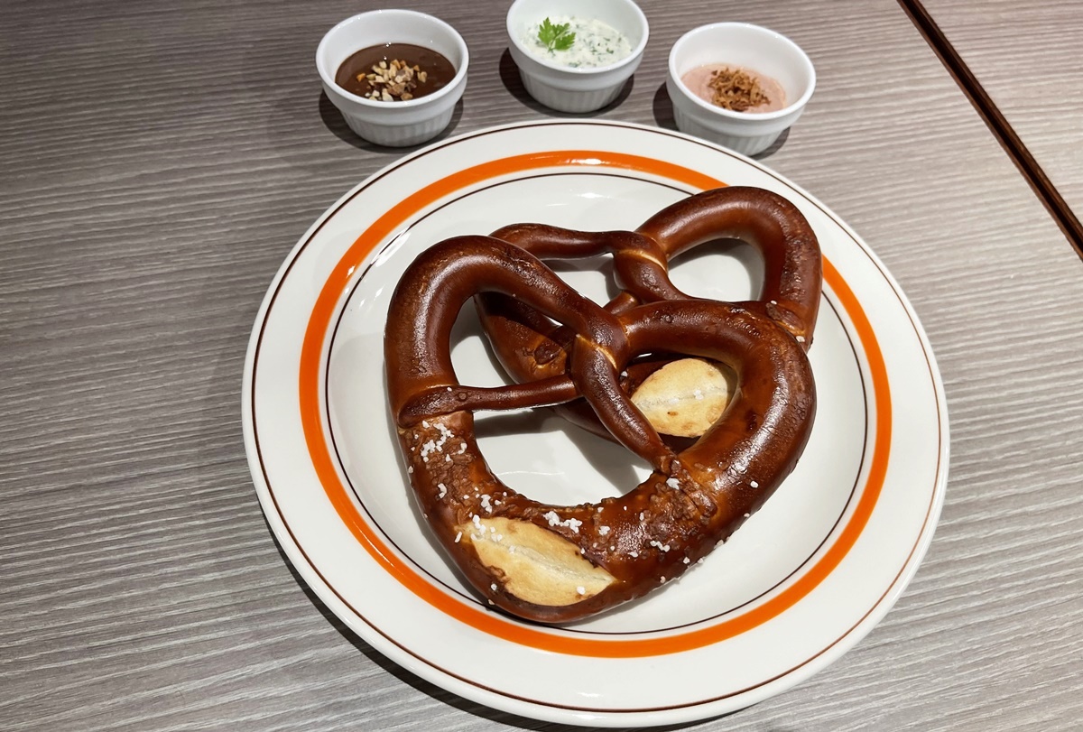 モーニング(7時30分~11時)、ランチタイム(11~15時)は、プレッツェルにディップやドリンクなどを組み合わせられるお得なセットや、ホットドッグ、サンドイッチなども用意されています。