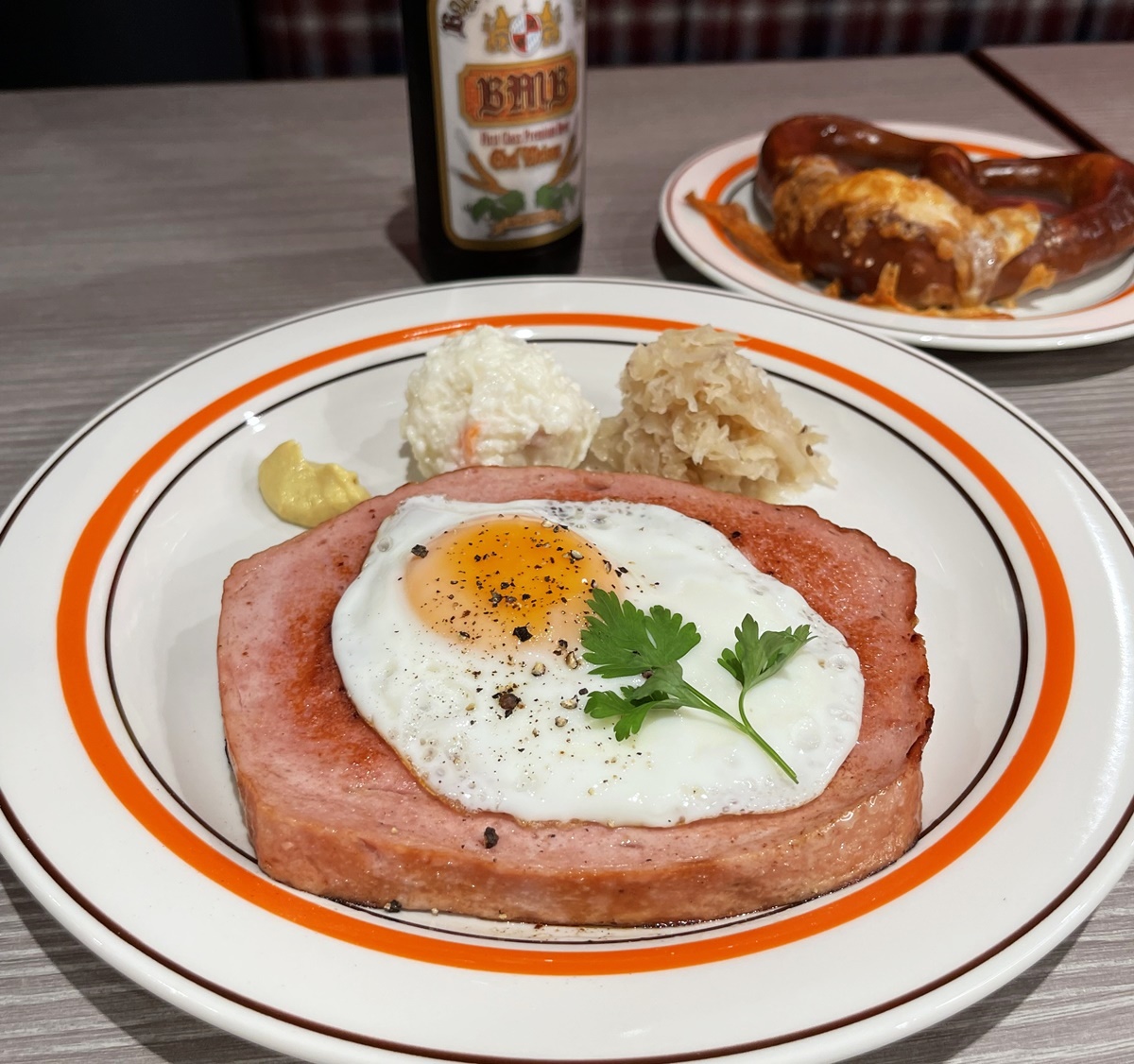 こちらでは、厚切りにしたレバーケーゼをこんがりと焼いて、半熟の目玉焼きをのせて提供されます。ひと口頬張れば、いっぱいに広がる豚肉のうまみに感動!玉子の黄身を絡めたり、マスタードを付けたり、“味変”を楽しみながらいただきます。