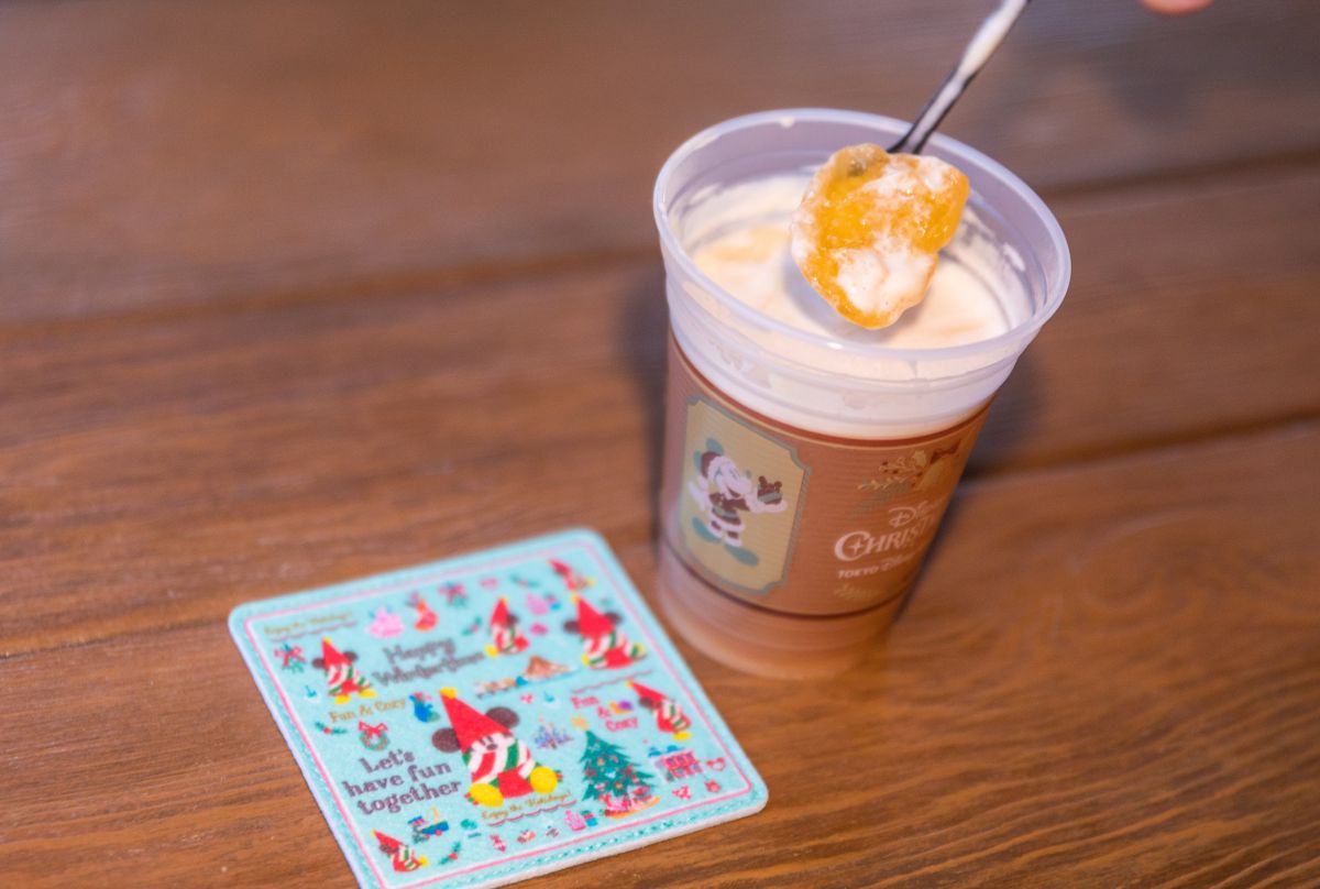 さらに中には大きくカットされたドライアップルの果肉もたっぷり。飲むだけじゃない楽しさもあって、今年のクリスマス、イチオシのドリンクです。リルリンリンのスーベニアコースターも記念にぜひ。