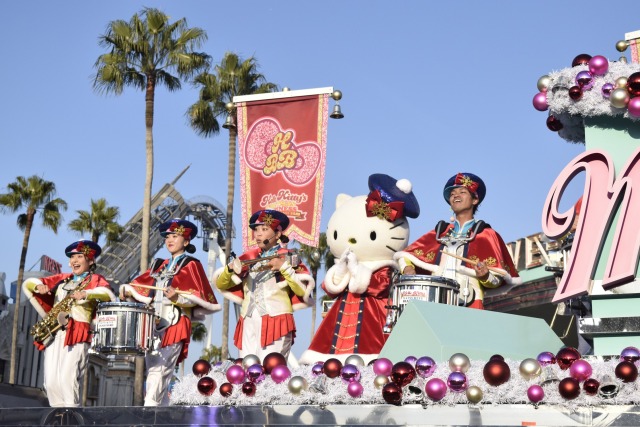 クリスマスらしい赤いドレスを着たハローキティとハピネス・ブラスバンドが野外ステージに登場。トロンボーンや太鼓の演奏で、みんなが知っているクリスマスソングを中心に歌います。