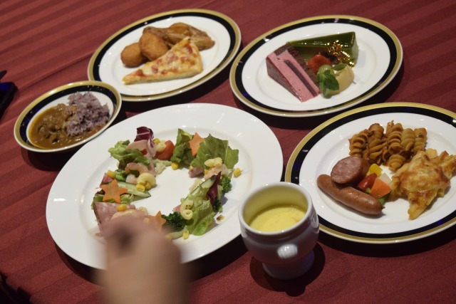 食事はビュッフェスタイルで、サラダからパスタ、ご飯もの、デザートまで、好きなものを少しずつ選んで、ラグジュアリーな空間の中で、ゆっくり楽しむことができます。