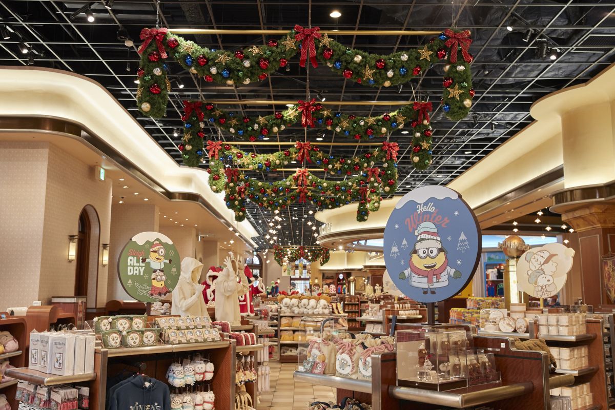 「ミニオン・マーケット・プレース」や「スヌーピー・スタジオ・ストア」などでは、冬バージョンのミニオンやスヌーピーグッズもずらりと並んでいます。大きなポンポンがついた「ミニオンのカチューシャ」は、冬コーデのボブとティムが頭のてっぺんに。