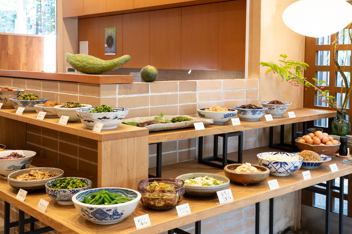 グルメガイドの星を獲得している奈良の懐石料理店「夢窓庵」が手がける、奈良の郷土食・茶粥と漬物バイキングのお店です。メニューは「お漬物バイキング」1700円のみ。奈良漬など20種以上の漬物、奈良県産米のご飯と茶粥、温泉卵、味噌汁、ほうじ茶、もなかが用意され、味噌汁以外は食べ放題です。