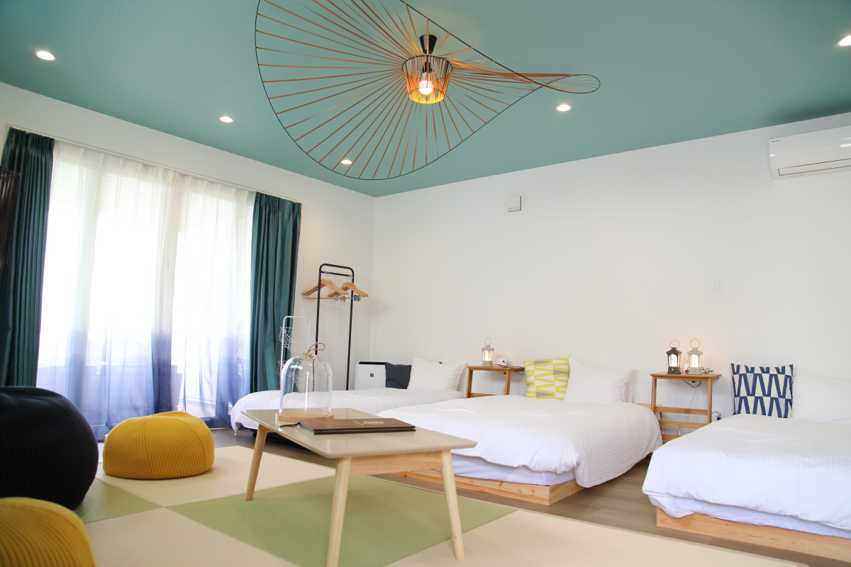 まずはスイートヴィラタイプのお部屋をご紹介。広々としたフローリングの中に、小上がりの畳がおしゃれなアクセントになっています。畳に布団を敷くことで5名まで宿泊できるので、ファミリーやグループ女子旅にもおすすめです。