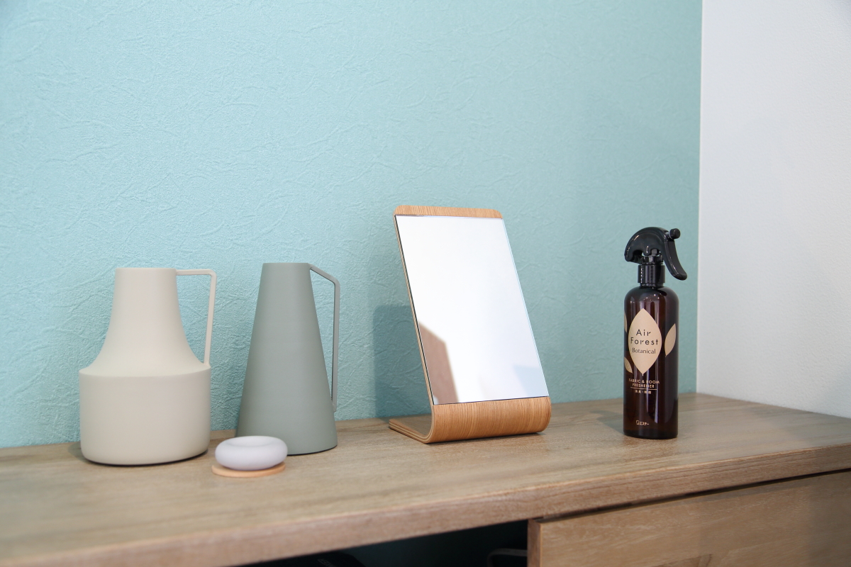 部屋の壁紙や調度品は人気のくすみカラーが使われ、統一感のある落ち着いた空間が演出されています。