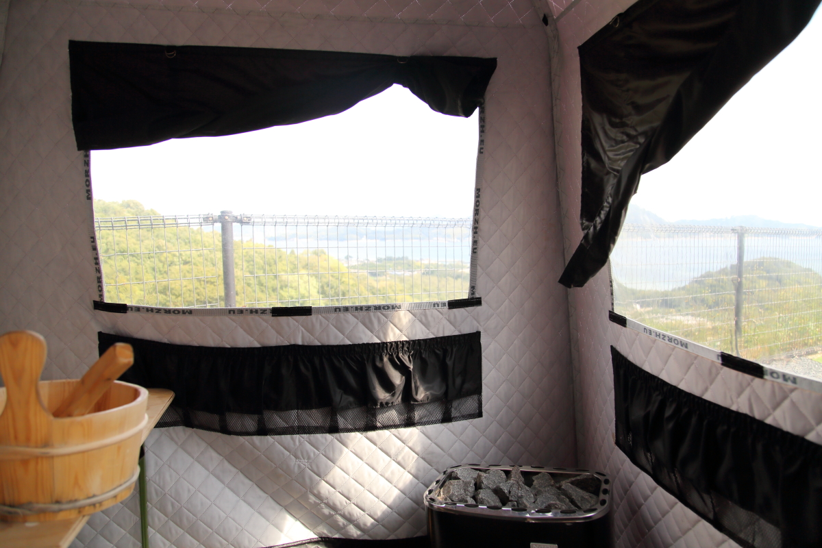 スイートヴィラとパノラマドームのテントサウナ設備は共通で、熱源は電気ストーブ。温度調節が簡単で、すぐに使えるのが特徴です。サウナストーンに水をかけて水蒸気を発生させる「ロウリュ」も利用可能。