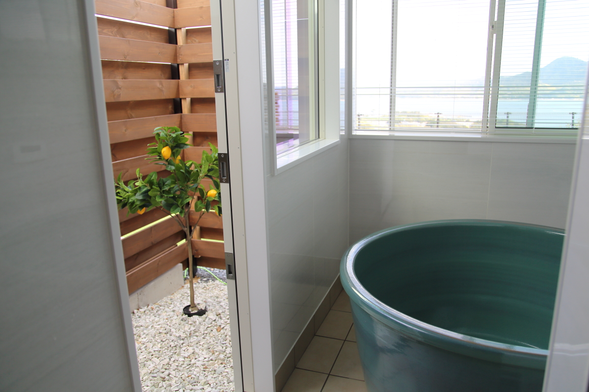 全部屋に個別のお風呂が完備されているので、アウトドア初心者でも安心してグランピングステイが楽しめます♪ 風呂釜には信楽焼が使われ、特別感が演出されているのもポイント。お部屋のタイプによっては海の見えるお風呂もあります。