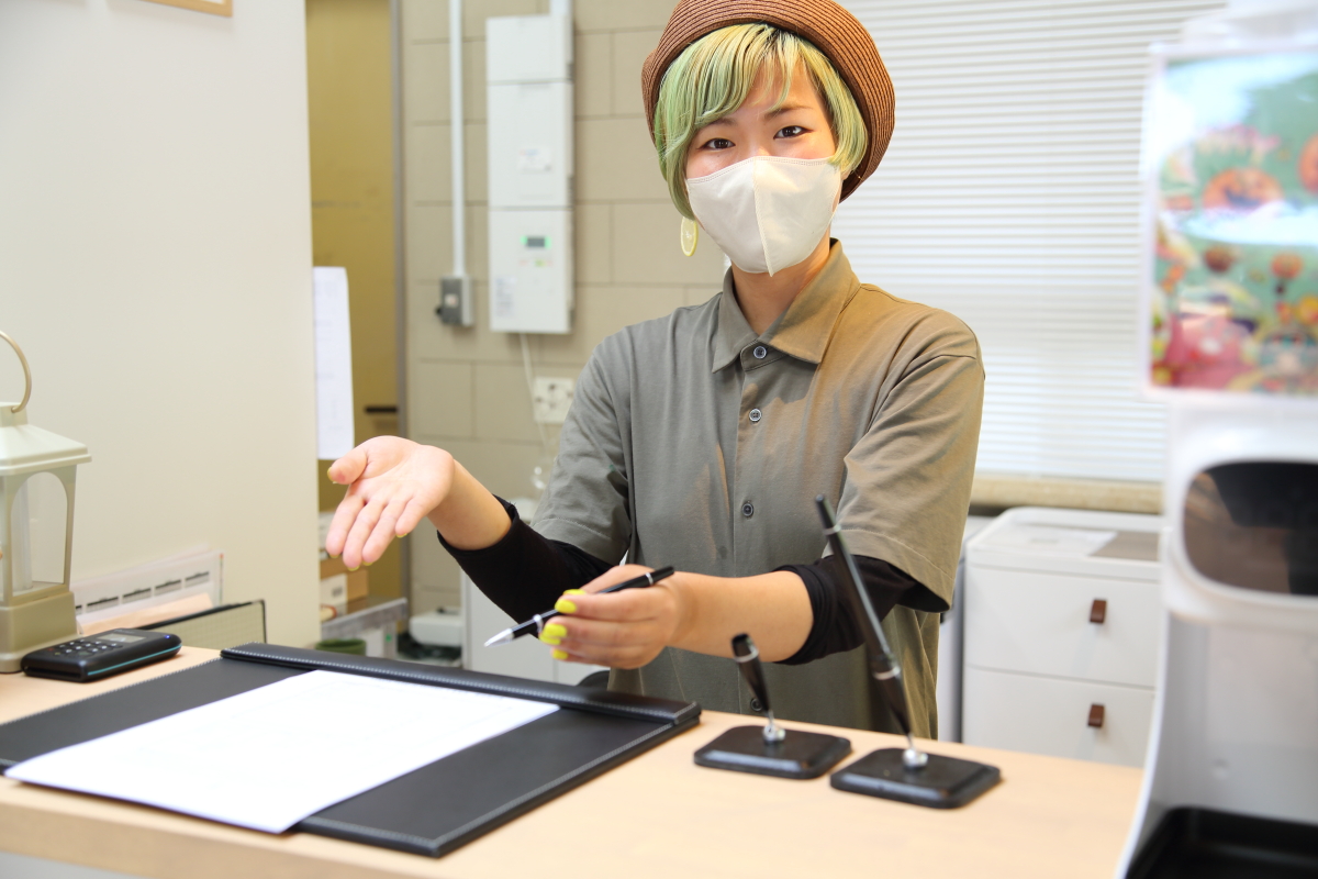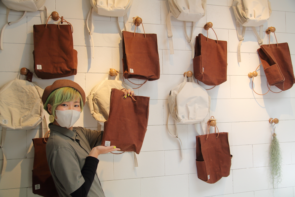 引き続き、インフォメーションでのサービスをご紹介。壁一面に掛かっているのは、原料からの帆布作りにこだわり、天然素材を活用した染め物を行っている「立花テキスタイル研究所」と共同制作で作られたオリジナルの帆布リュック。館内移動用で貸し出ししているほか、商品を購入することも可能です(茶1万7380円、白2万