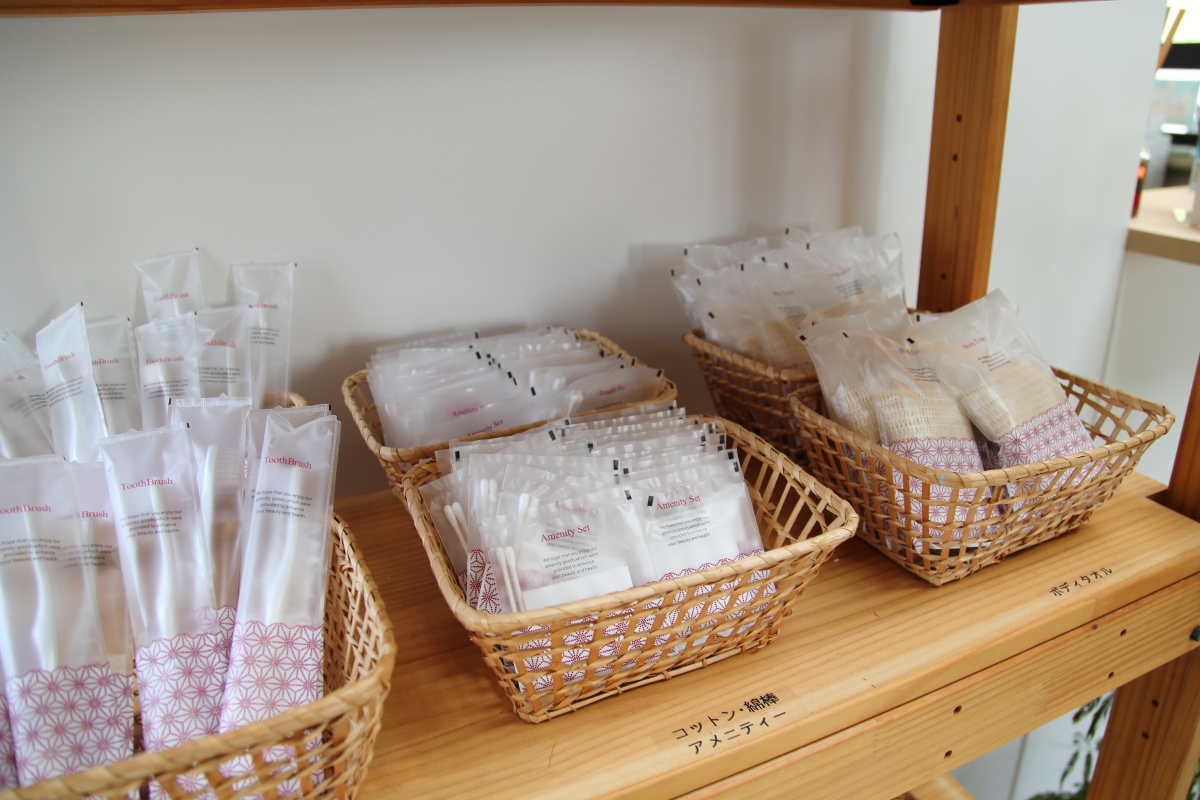 受付横にはアメニティバーと室内着の貸し出しがあるので、必要なものを帆布リュックに入れてお部屋に向かいましょう♪