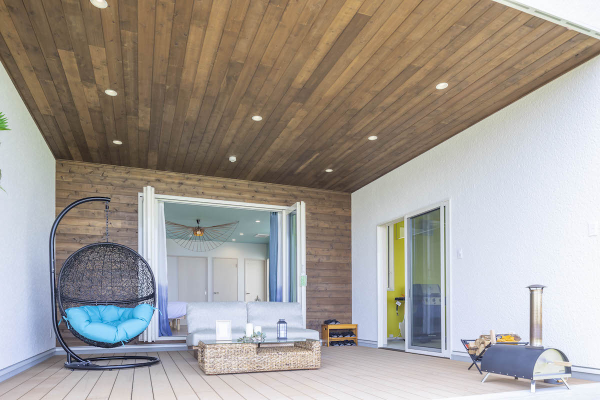 プライベートガーデンへと続くテラスには、ソファや吊り下げ型のハンキングチェアが。もし雨が降ってしまったときも、屋根つきの半屋外テラスで過ごせるのは、うれしいポイントですね。