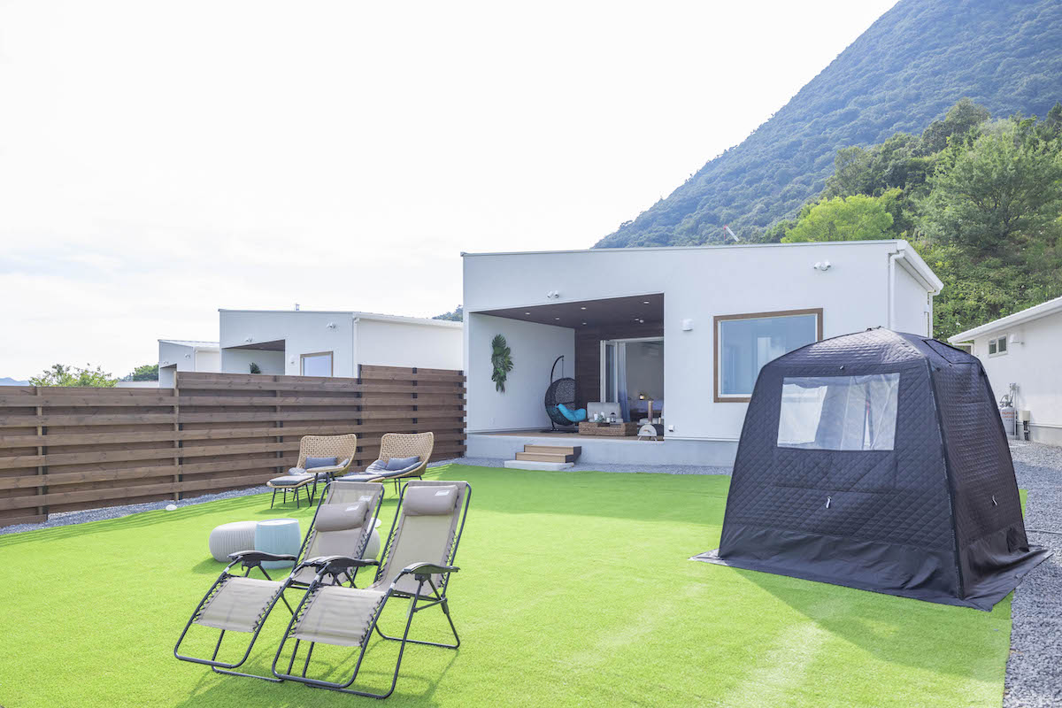 冷暖房完備で快適に過ごせることはもちろん、広々としたプライベートガーデンにはファイアピット(焚き火台、薪1束無料)も設置されているので、部屋で過ごすのもよし、外で過ごすのもよし。各自が思い思いの時間を堪能することができます。