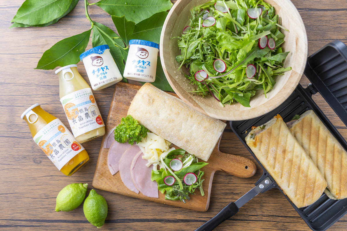 「グランピングBBQプラン」には朝食もついています! メニューはホットサンド、地元野菜のサラダ、ヨーグルト、ジュースと、地元の新鮮食材や柑橘ジュースで体の目覚める朝ごはんが堪能できます♪