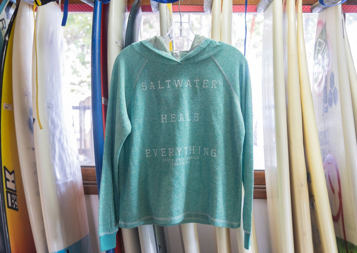 Tシャツ以外のアイテムもかわいいものがいっぱいです。ハワイ発のライフスタイルブランド「ソルトウォーター・ヒールズ」との「コラボパーカー」$44は、少し肌寒い日にサッとはおれる便利アイテム。軽くて薄い素材なので、旅行にもぴったりです。