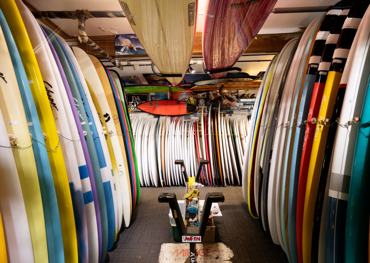 「サーフ&シー」はサーフショップなだけあって、店内にはサーフボードのストックがたくさん!ロングボードやショートボードがぎっしりと並んでいる様子は圧巻です。サーフボードの他、リーシュコードやデッキパッドなどサーフィンに必要なアイテムも揃います。