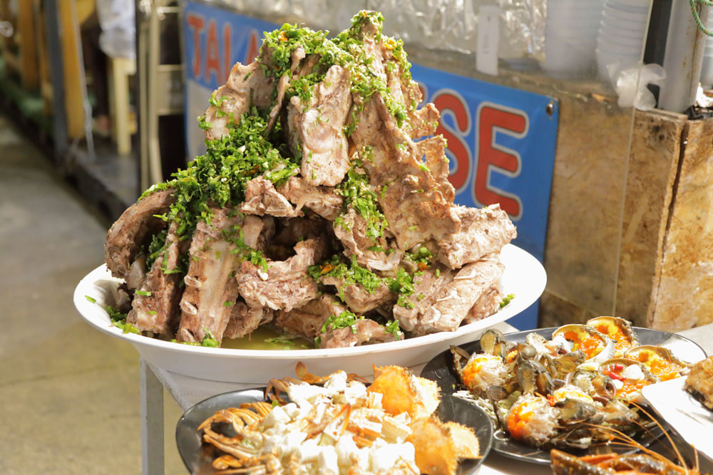 迫力満点のこちらはマーケットの名物料理のひとつ、唐辛子とハーブがたっぷりのポークリブのスープ。料金はMサイズB390、LサイズB490、XサイズB1690。ピリ辛風味で、手づかみで豪快に味わいます。