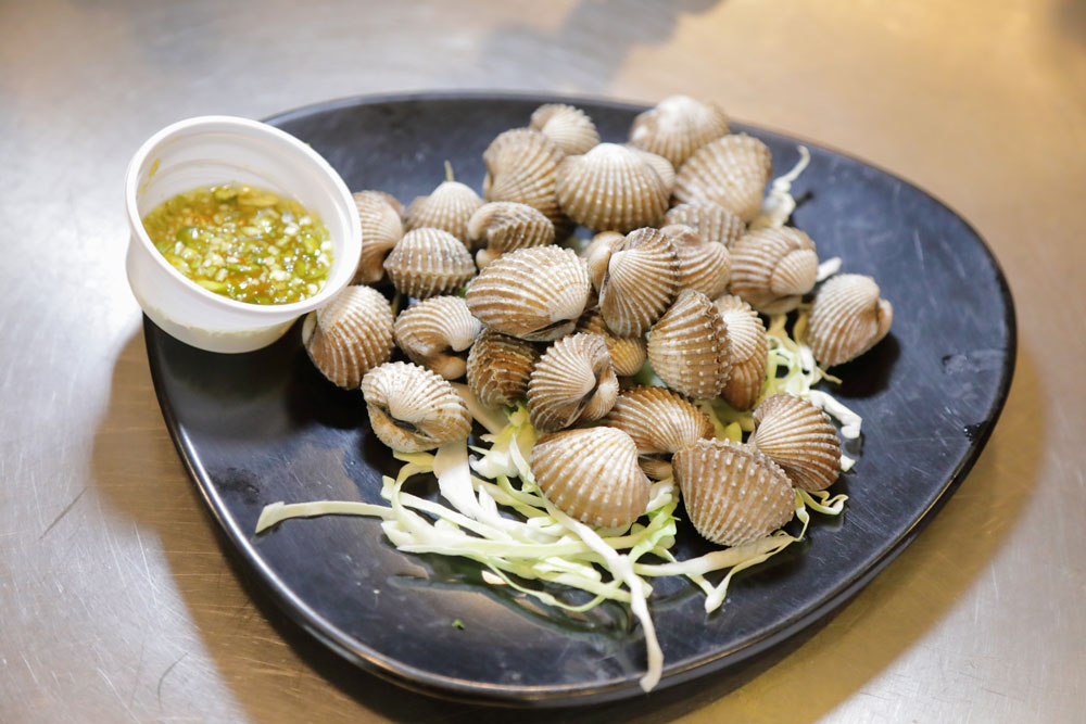 二枚貝を蒸した料理、「ホイクレーン」はB150。スパイシーなシーフードソースをつけて味わいます。スパイシーな味わいと貝のうまみがビールのおつまみにぴったり!エビや魚の炭火焼なども人気ですが、お手頃価格で色々なおつまみを食べたい派の方はぜひお試しを!