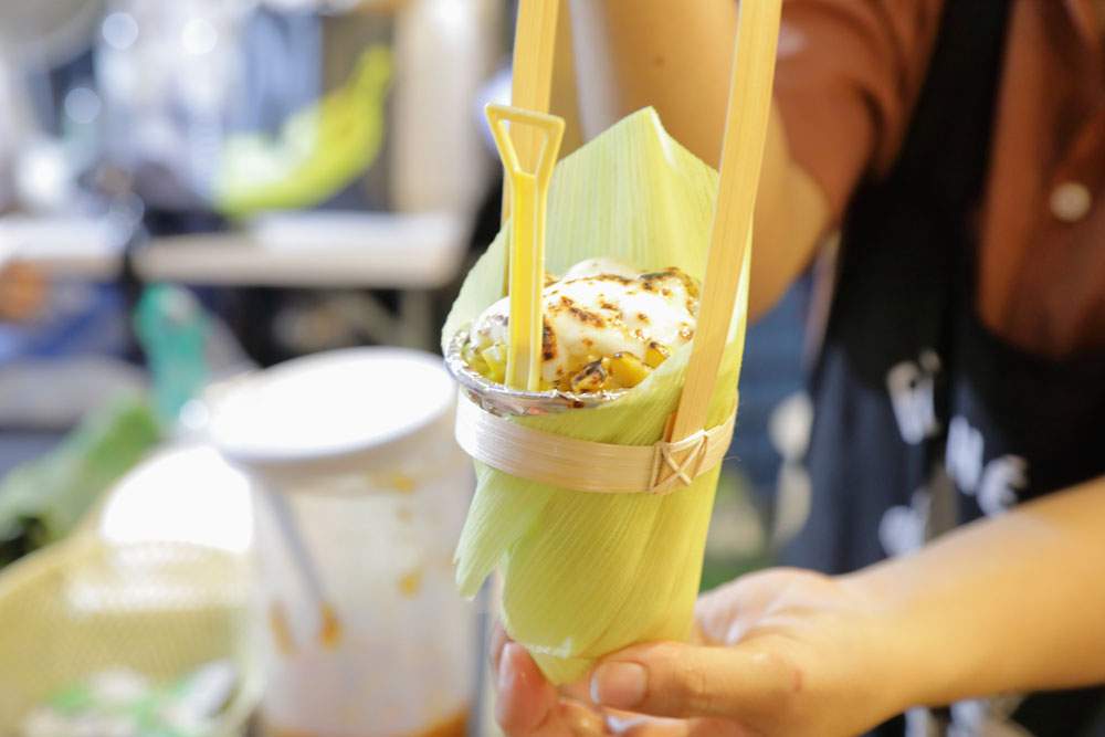 見た目もかわいい「バターコーン」B39。チーズやベーコンなど各B10でトッピングできます。とってもシンプルなストリートフードですが、トウモロコシの皮と竹で作った入れ物のキュートさで大人気です。