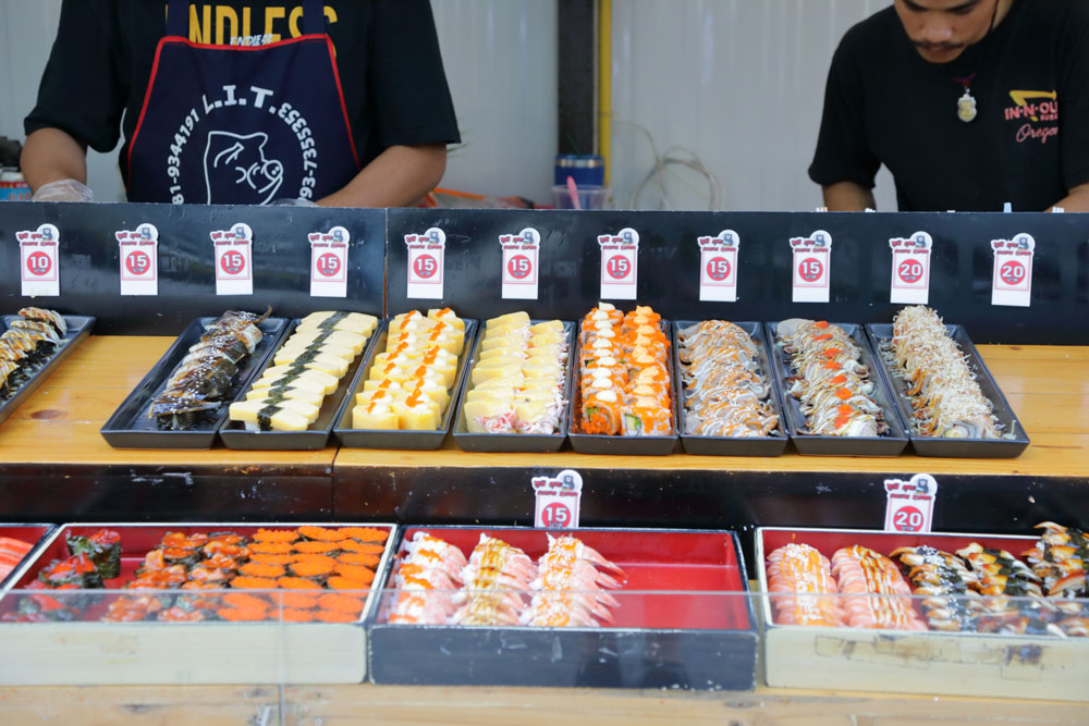 日本のソウルフード、寿司の露店もありました!1貫B10~のお手頃価格で揃っており、サーモン、エビ、穴子など定番のネタのほか、オリジナリティあふれる寿司も並んでいます。