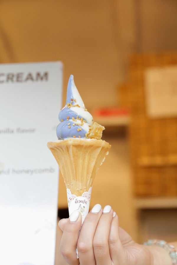 ハチミツがたっぷりの「バタフライピーとヨーグルトのソフトクリーム」B69。フローズンヨーグルトの爽やかでさっぱりとした口当たりと、ハチミツの濃厚な甘みがベストマッチ。週末の19時以降は行列必至の人気店です。