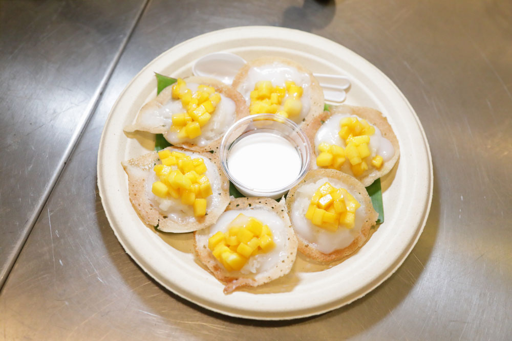 タイの定番スイーツ「カノム・クロック(6個)」B75。米粉にココナッツミルクを加えてたこ焼きのように焼いたもので、トッピングの細かくカットしたマンゴーがアクセントになっています。
